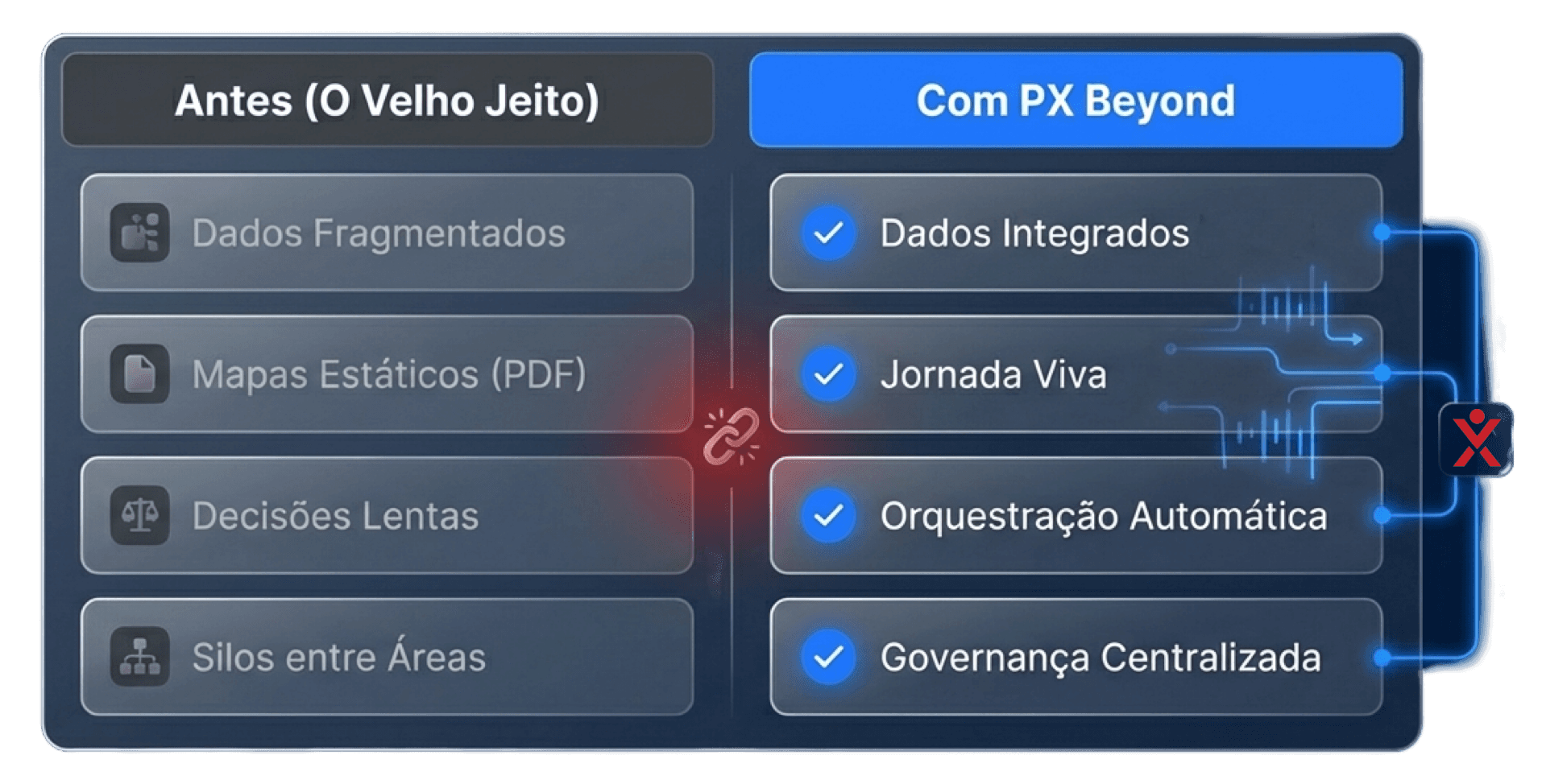 O PX Beyond conecta dados reais, I.A. e automação para transformar diagnósticos estáticos em um sistema operacional que entende e antecipa as expectativas do cliente.
